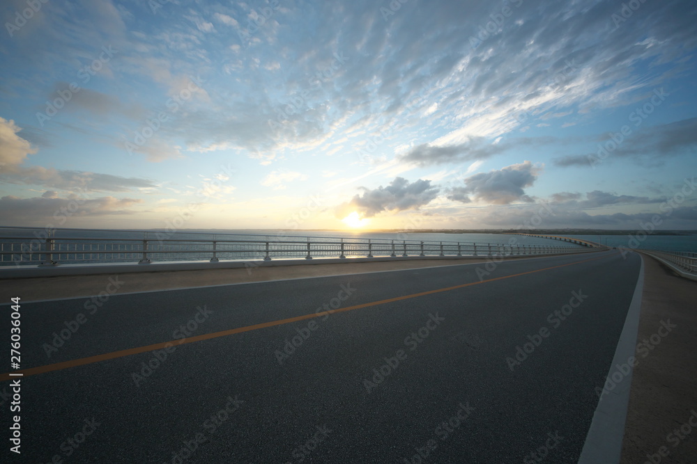 Miyako island, Japan - June 28, 2019: Irabu bridge, the longest charge-free bridge in Japan, connecting Miyako island and Irabu island just after the sunrise