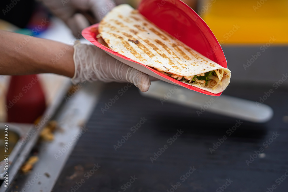 Hands of hands of chef making healthy fresh tortilla for fajitas or fajitos. National food, fresh oganic food, recipes and cooking