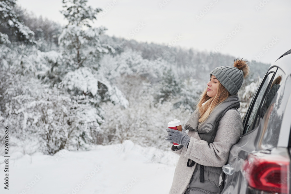 Feel the moment. Pretty girl in warm clothes standing in the winter wood while leans on the car and holding cup of coffee