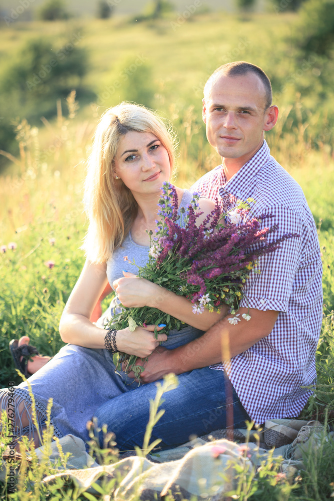 Man and woman on nature with a bouquet of flowers. Couple in love.
