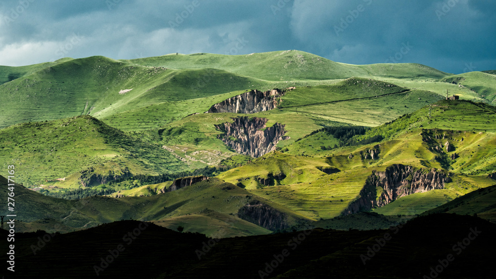 Stunning landscape near Goris city in Armenia. Green mountains and rocky cliffs in the sun after a storm.