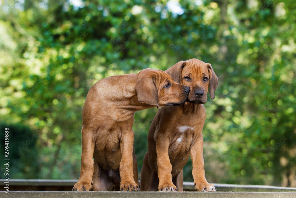 Hunde zwei süße Rhodesian Ridgeback Welpen Rassehunde geben sich einen Kuss