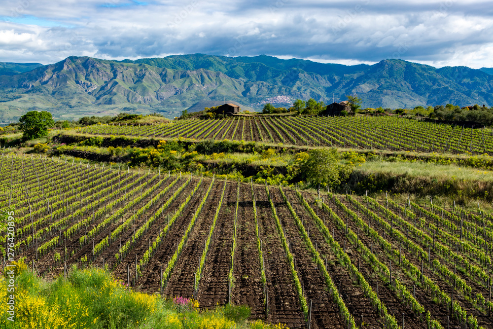 Landscape with green vineyards in Etna volcano region with mineral rich soil on Sicily, Italy