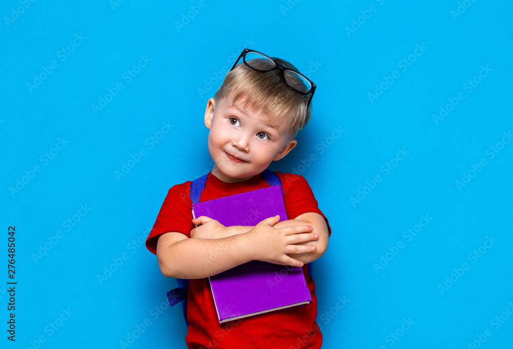 small happy smiling boy with glasses on his head, book in hands, schoolbag on his shoulders. back to school. ready to school