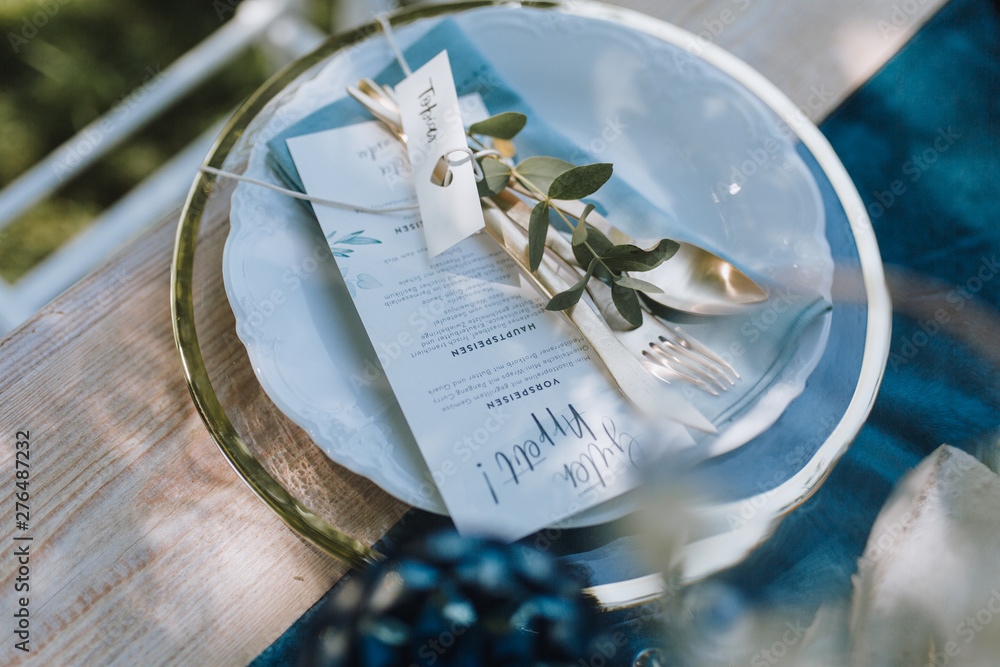 Hochzeitsdekoration Schmuck und Blumen Torte Weiß und blau