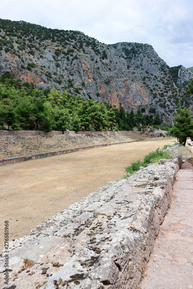 Ancient greek stadium made from limestone in Delphi, Greece
