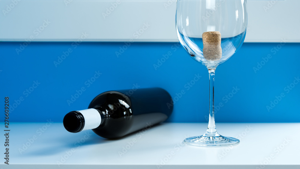 Empty wine glass on a white table next to an empty dark glass wine bottle. Cork inside