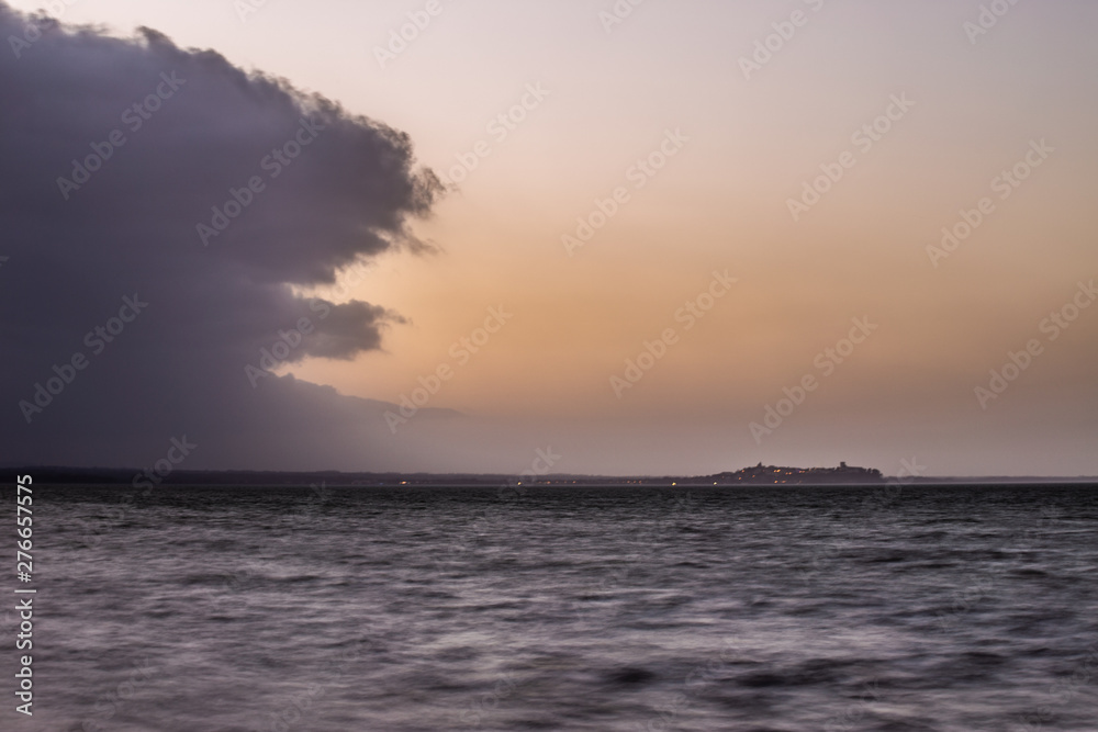 Beautiful view of Trasimeno lake (Umbria, Italy) at sunset, with empty sky and a big cloud on the left