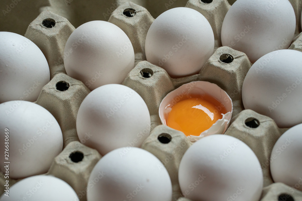 Half cracked egg in the paper egg tray. Egg yolk in egg shell. White eggs