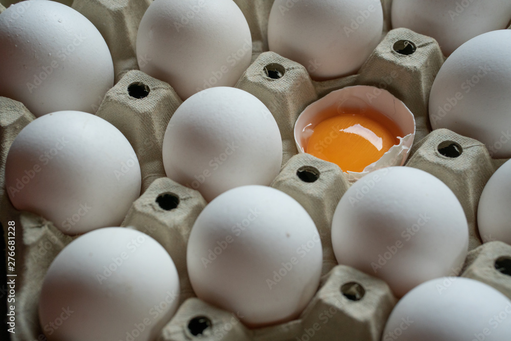 Half cracked egg in the paper egg tray. Egg yolk in egg shell. White eggs