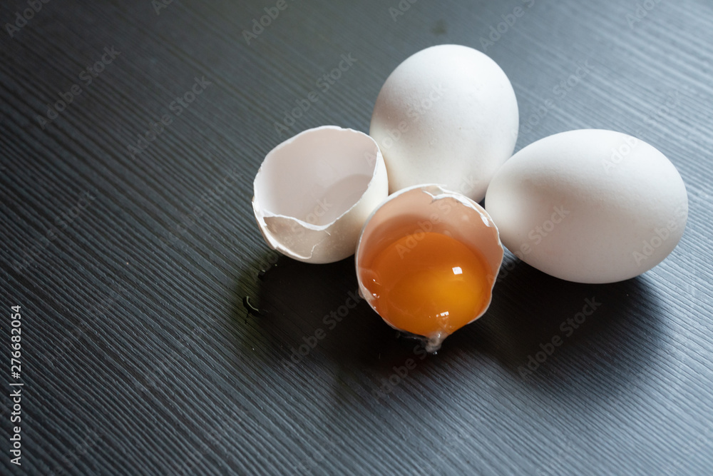 Half cracked egg on the black background. Egg yolk in the egg shell on the black background. Organic eggs.