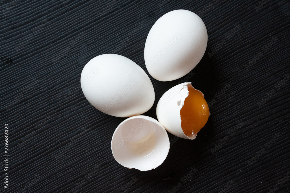 Half cracked egg on the black background. Egg yolk in the egg shell on the black background. Organic eggs.