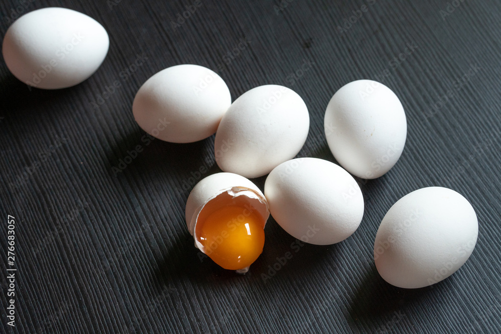 Half cracked egg on the black background. Egg yolk in the egg shell on the black background. Organic eggs.