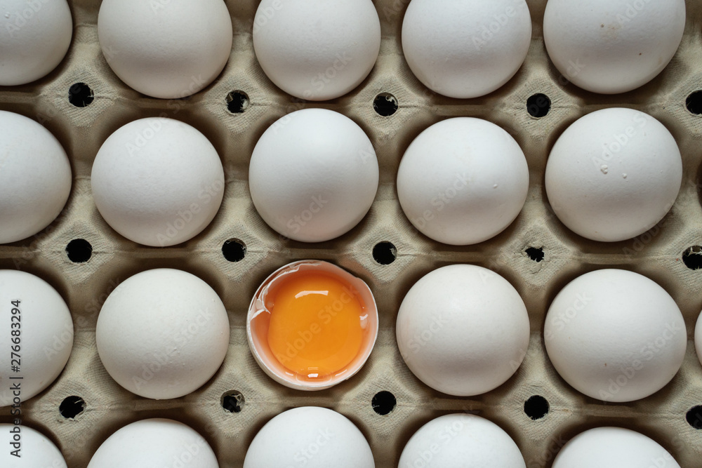 Half cracked egg in the paper egg tray. Egg yolk in egg shell. White eggs