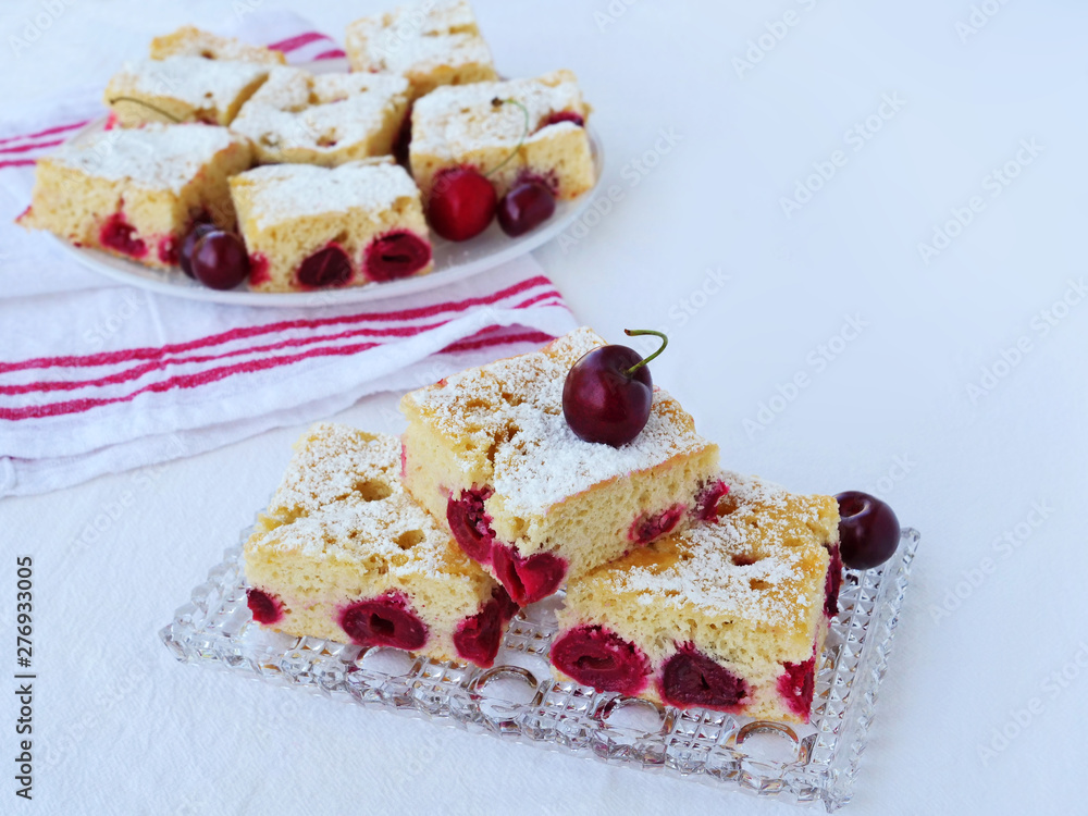 Sour cherry cake dusted with powdered sugar on glass tray and plate over white table