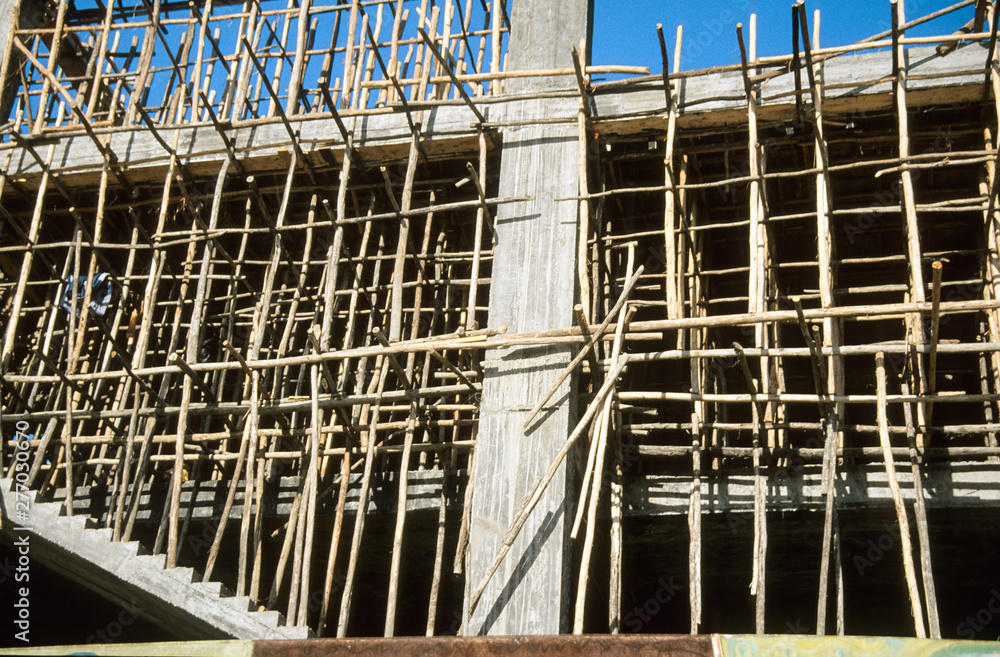Baugerüst, Äthiopien - Das wenig vertrauens erweckend wirkende Gerüst aus Holz und Bambus ist in jedoch durchdacht und seh stabil