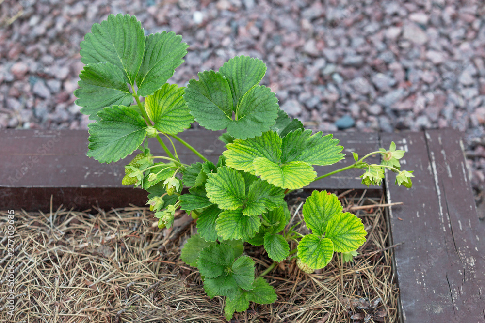 Pale, yellow,bleached strawberry leaves.Yellowing of leaf tissue.Chlorosis plants.Plant disease.Concept of treatment and remedies plant diseases.