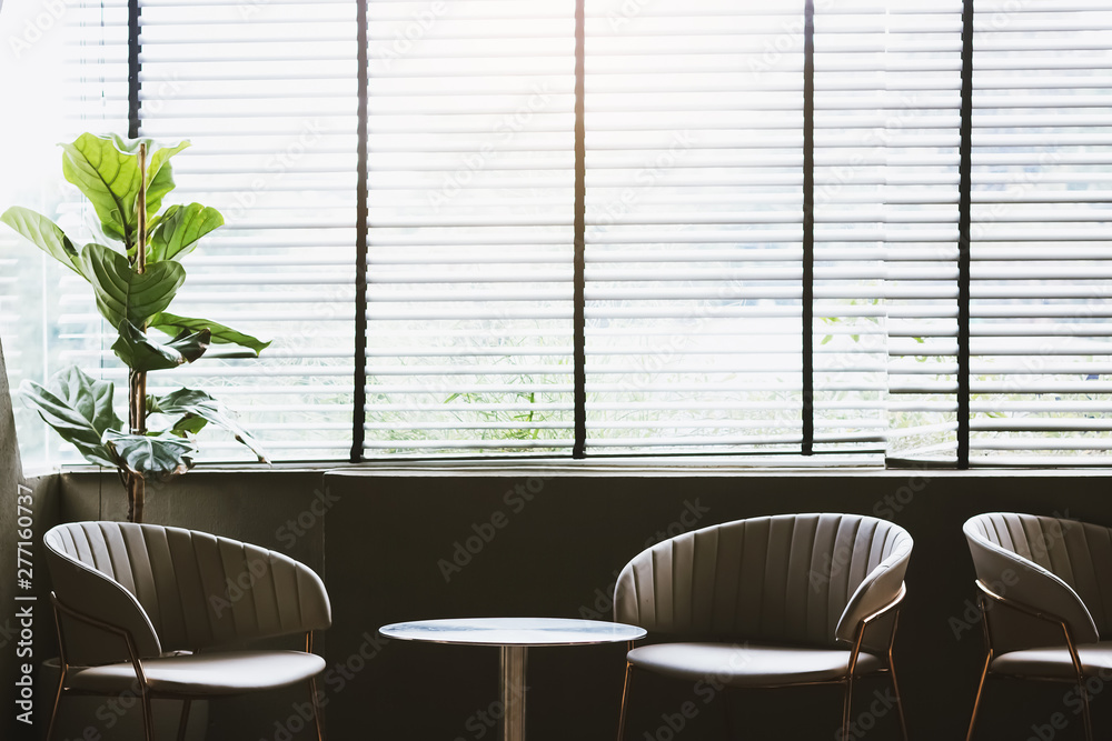 Chairs and glass table decorated with plants in pots in living room near big bright window with louvers