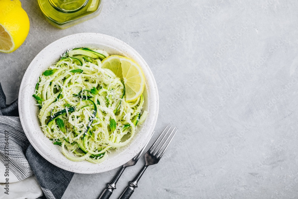 Green vegetarian pasta. Spiralized zucchini noodles with mint, lemon and parmesan cheese