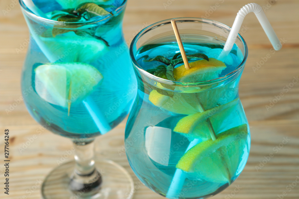 Cocktail blue lagoon in a cocktail glass with lemon and mint on a natural wooden table in the bar. cool summer cocktail