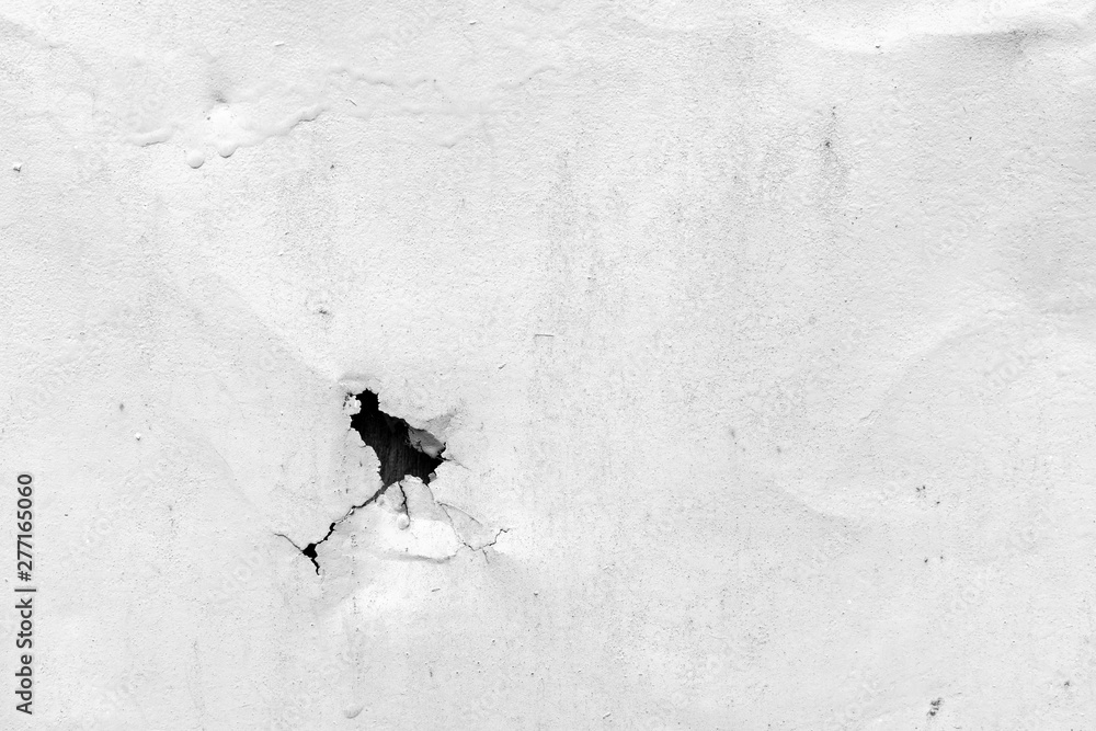 hole in a white metal sheet. Hole in the iron wall. Damage to the white metal surface