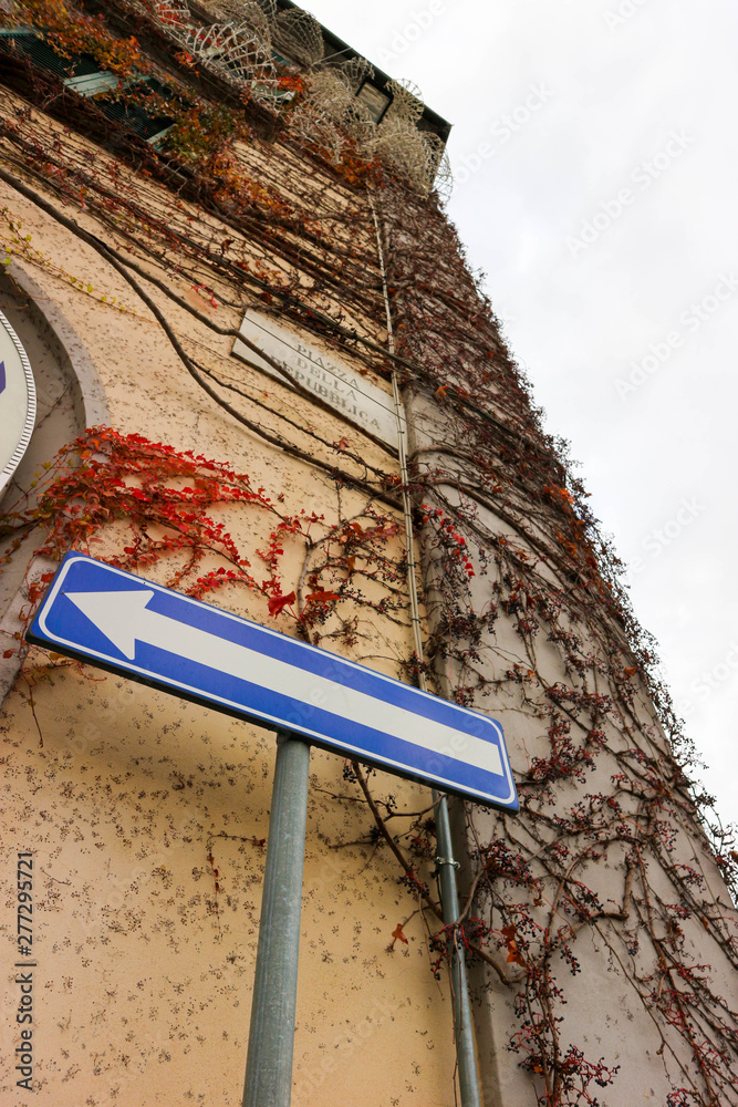 Road sign with old house wall with grapevine on the background and italian street address plate on it
