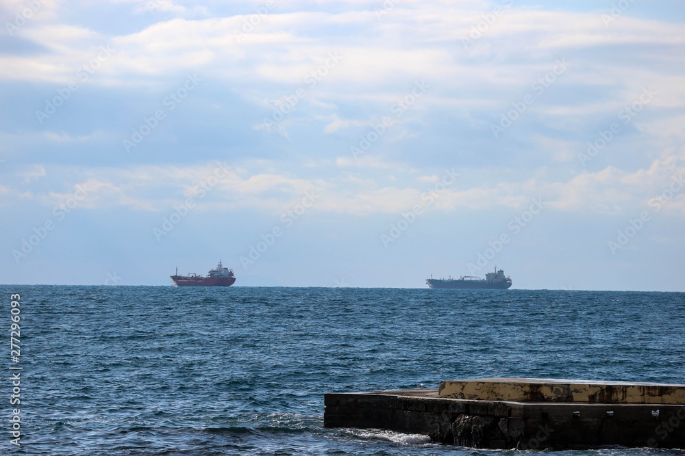 Two cargo ships waiting for their turn to enter the port of Livorno, Italy