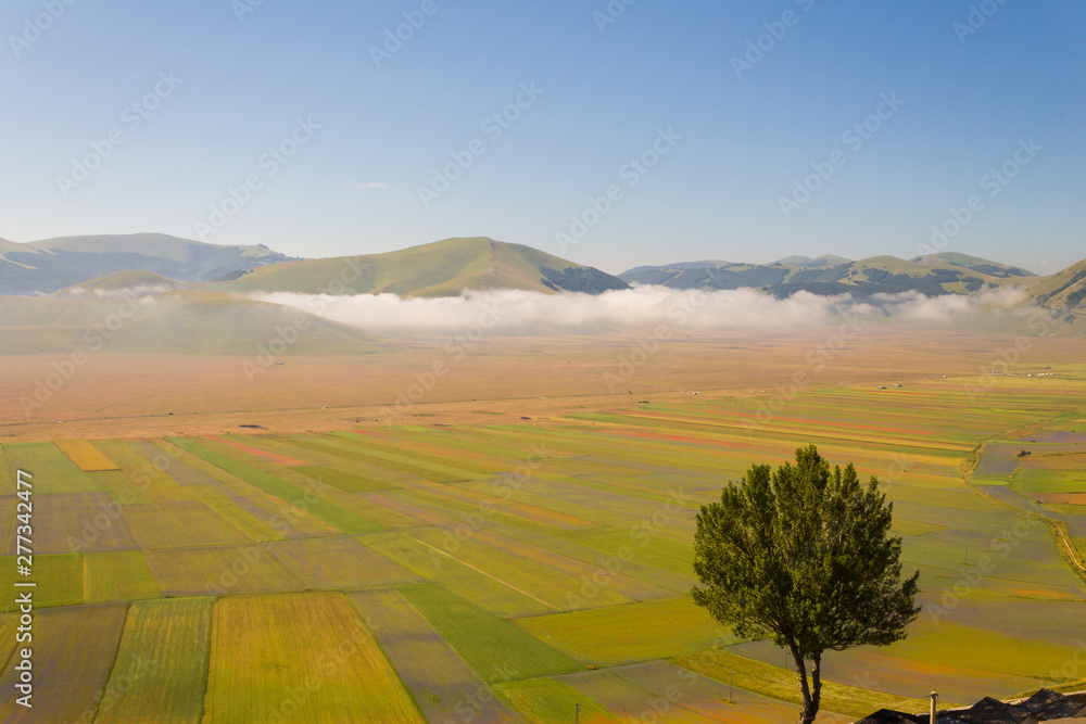 Berautiful view of an isolated tree above the Castelluccio di Norcia (Umbria, Italy) Pian Grande