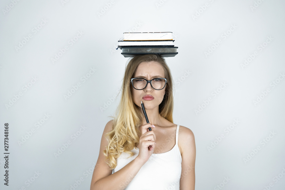 serious young woman in glasses holding pen in her hand and books on her head isolated white background