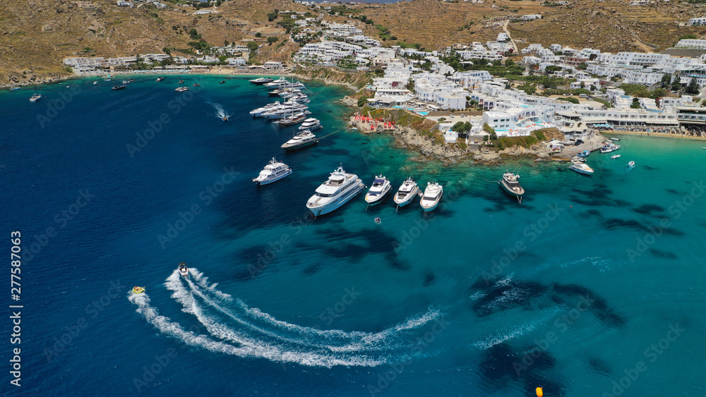 Aerial panoramic photo of famous turquoise clear sea celebrity sandy beach and bay of Psarou with yachts and sail boats in iconic island of Mykonos, Cyclades, Greece
