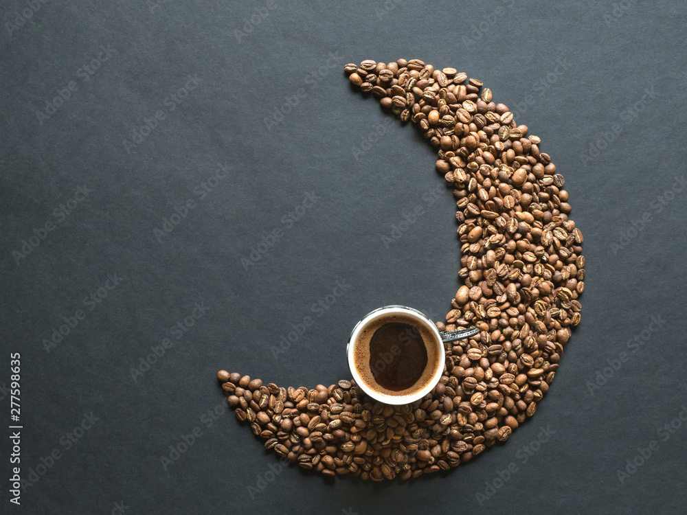 Crescent shape made of coffee beans and a cup of black coffee on black background. Top view