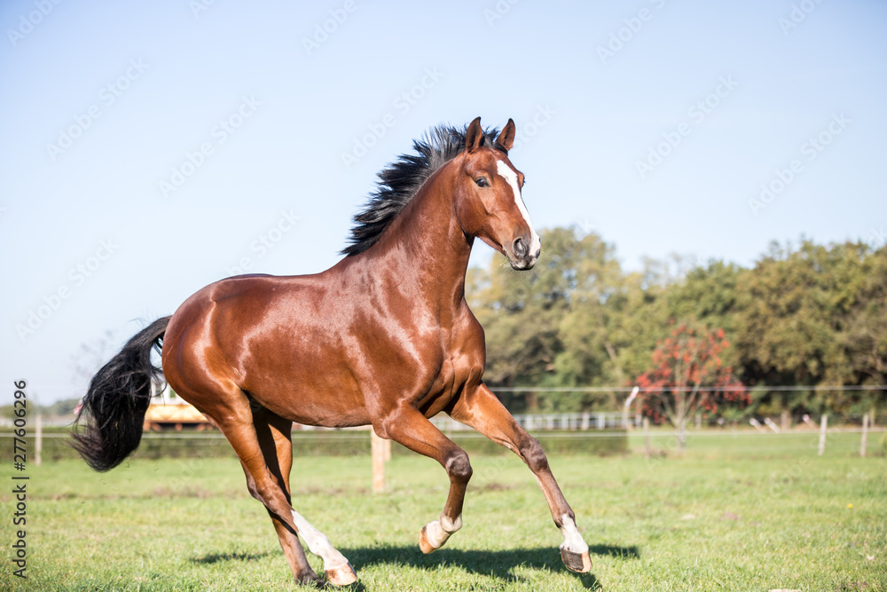 braunes schönes Pferd Warmblut mit hübscher Blesse auf der Weide, galoppiert über die Herbstliche Wiese