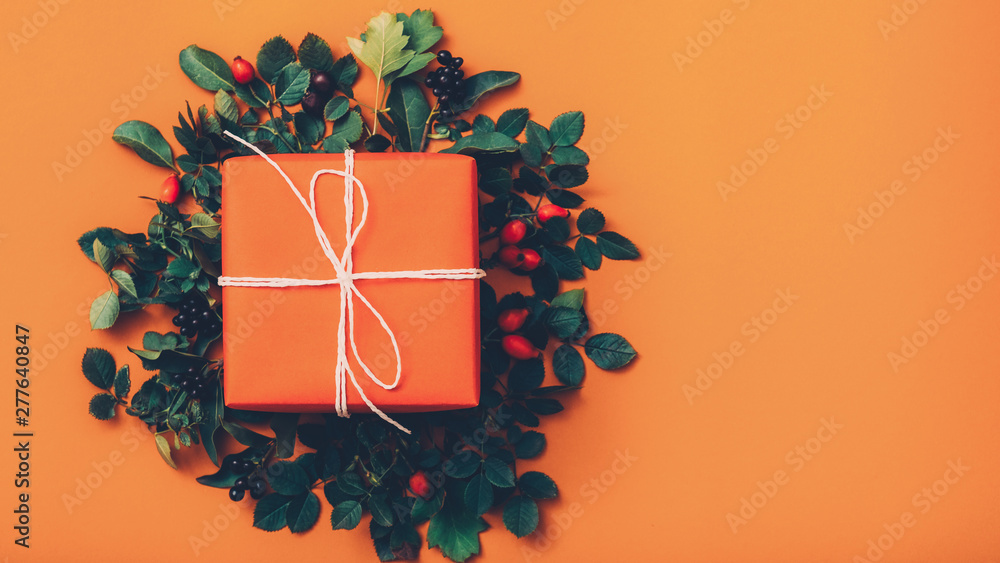 Floral art and craft ideas. Top view of handmade gift box with rose hip berries and green leaves on orange background. Copy space.