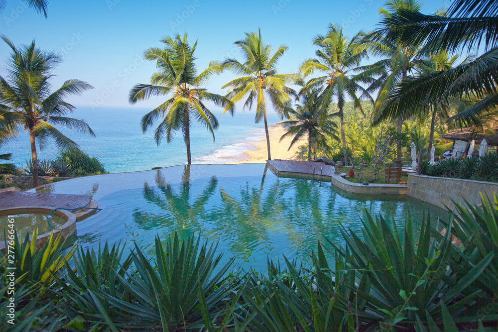 The pool on the edge of the rock overlooking the ocean and palm trees
