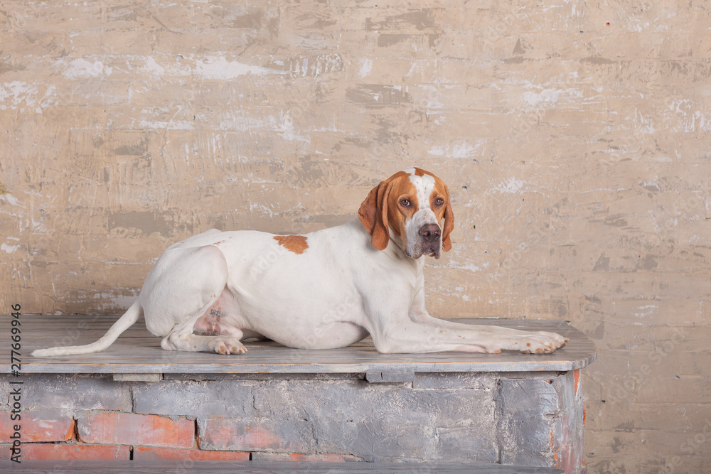 English pointer posing in a photo Studio at the background of vintage brick wall