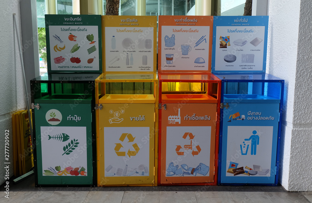 Energy complex building, BANGKOK THAILAND - MAY 31, 2019. Different colored trash cans