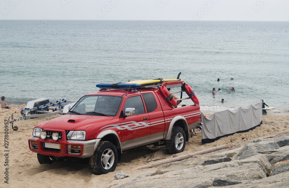 Equipa de socorros naufragos, pronta a actuar numa praia com um veículo de tração 4x4
