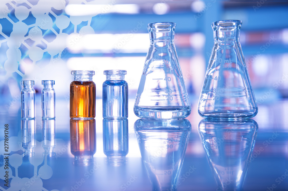 glass flask and blue and orange solution in vial for medical science and education experiment laboratory on chemical structure background