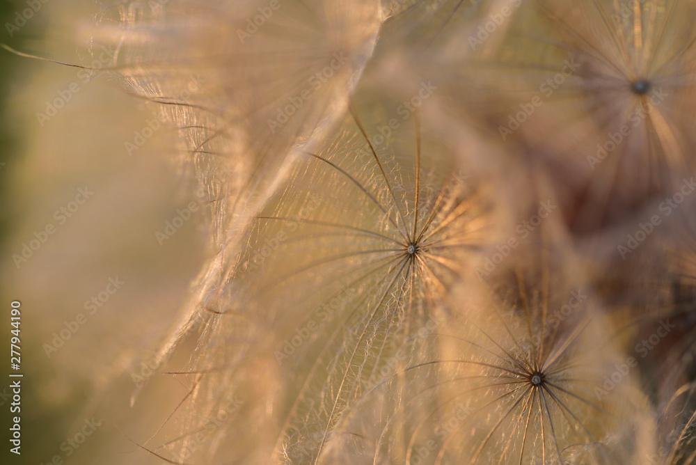 Nahaufnahme eines Schirmchens eines Flugsamens bei Sonnenuntergang als Hintergrund