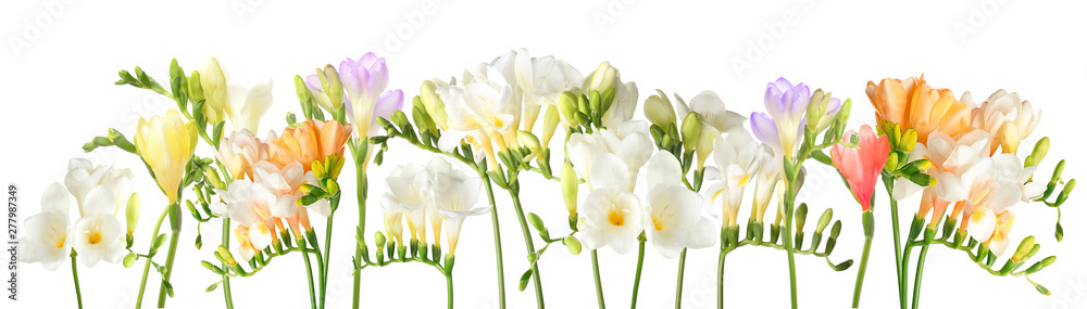 Beautiful freesia flowers on white background