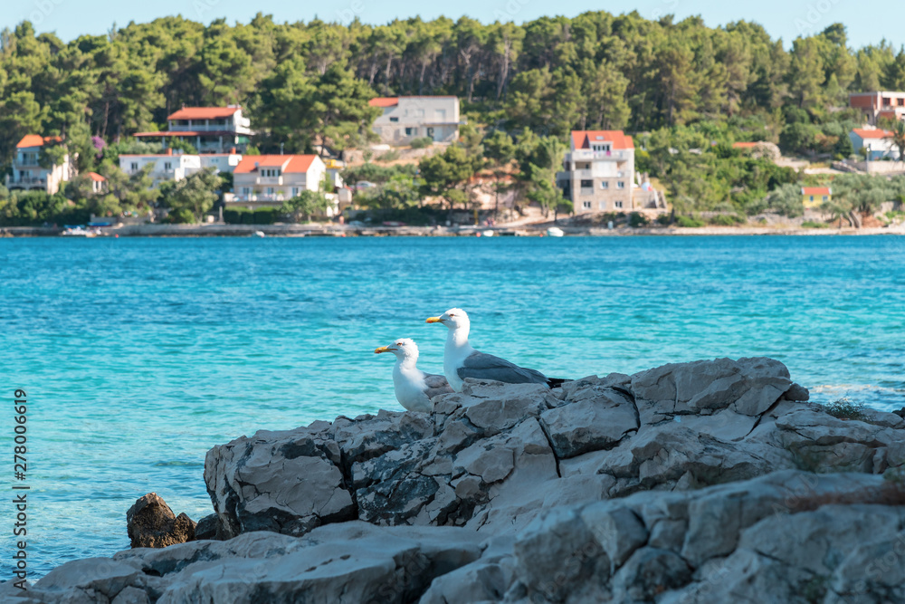 Two seagulls sitting on the rocks on the background of the sea