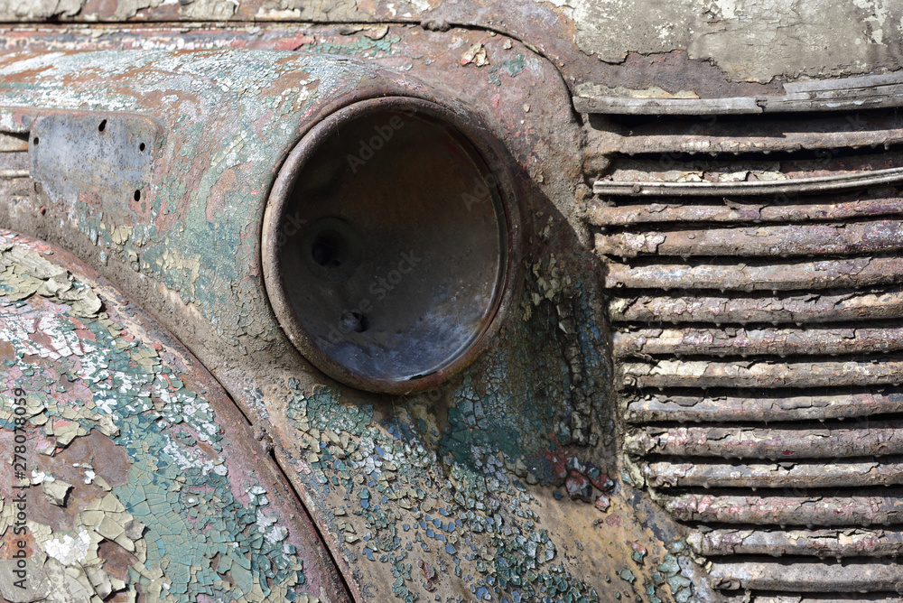 Detail of an old rusty car with paint peeling off