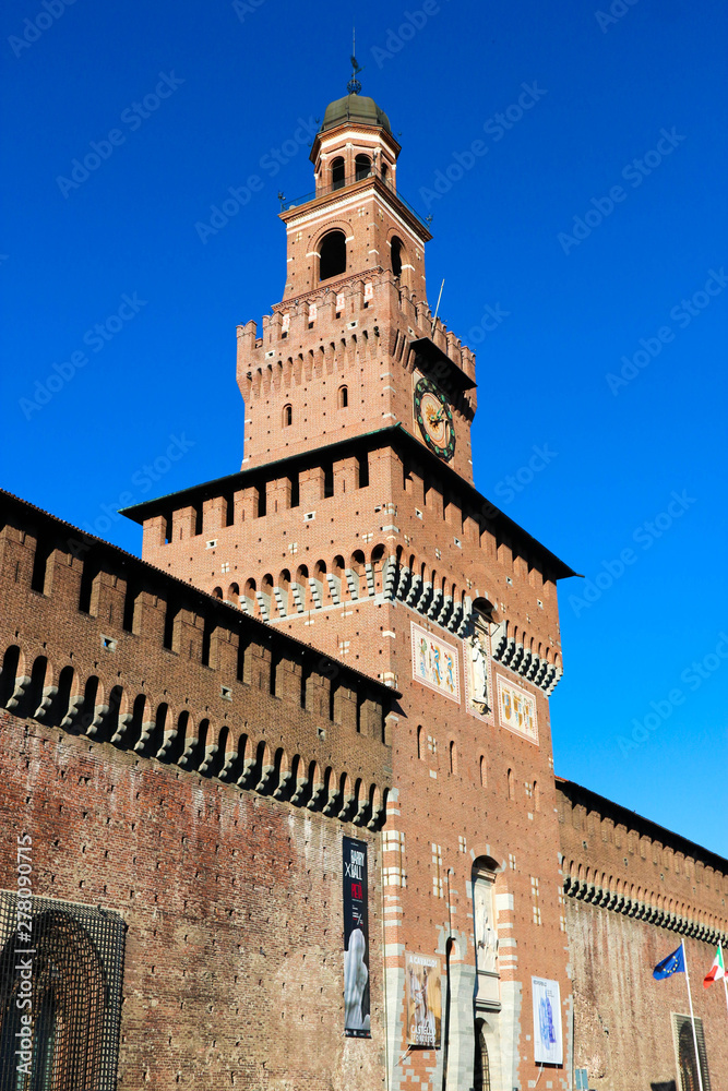 The Filarete Tower of Sforza castle in Milan, italy with blue sky on the background