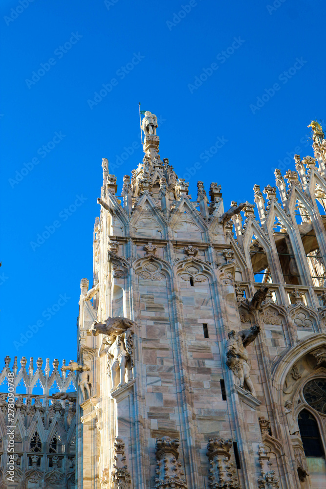 detail of the roof of gothic cathedral in milan, largest church in Italy with blue sky on the background