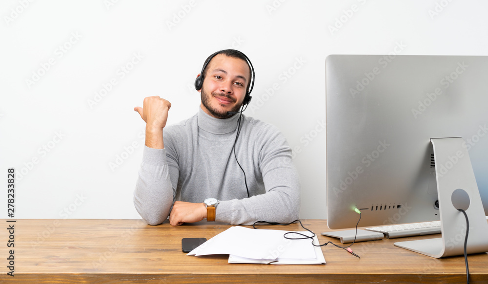 Telemarketer Colombian man pointing to the side to present a product