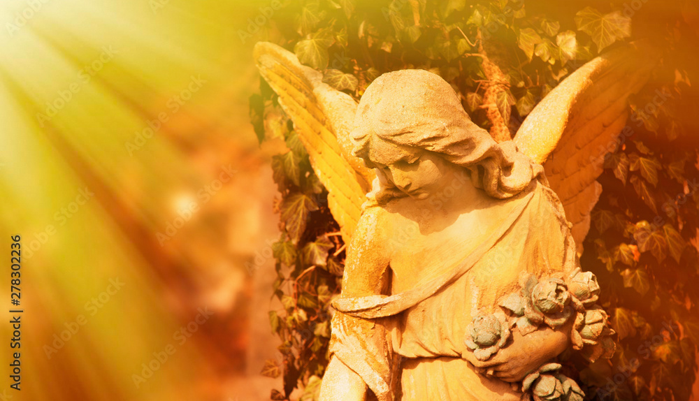 Antique statue of wonderful angel in the rays of the sunl on sky background