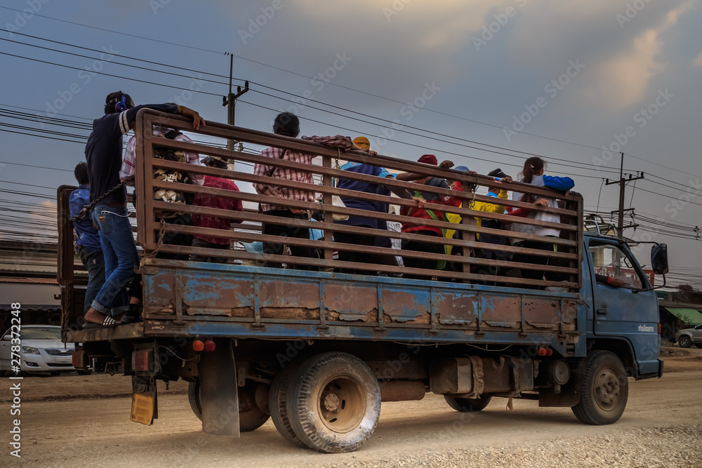 Gruppe von Männern wird auf der Ladefläche eines Lastwagens transportiert, öffentliche Straße in Thailand