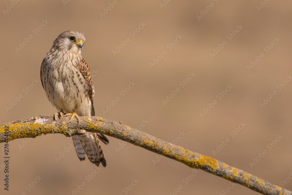 A close-up of a beautiful female Lesser Kestrel perched on a branch (Falco naumanni)