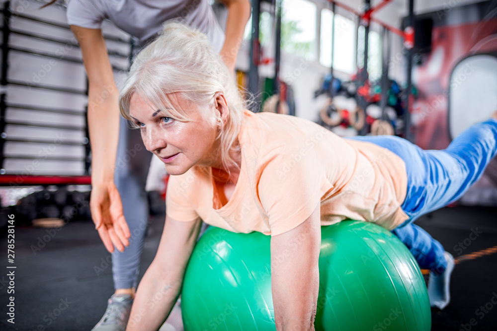 Senior woman with trainer doing rehab using pilates ball in the rehabilitation center