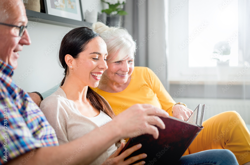 Senior couple with their daughter looking at photos in family album together